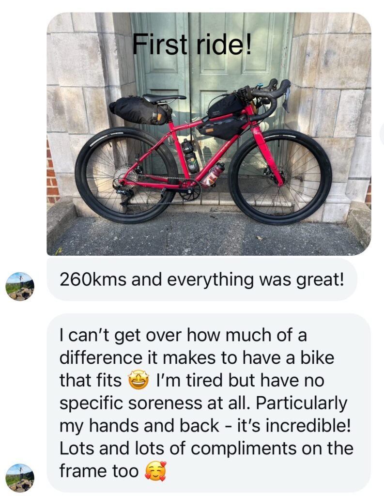 We organised a bike fit, agreed a design and this is what came out. Dot watching along was amazing as she showed true determination and successfully finished the event from Santiago de Compostela in Spain to Constanta in Romania, 5100km away, in 37 days. That equates to around 85 miles a day, self supported and during a super hot European summer. What an amazing achievement.